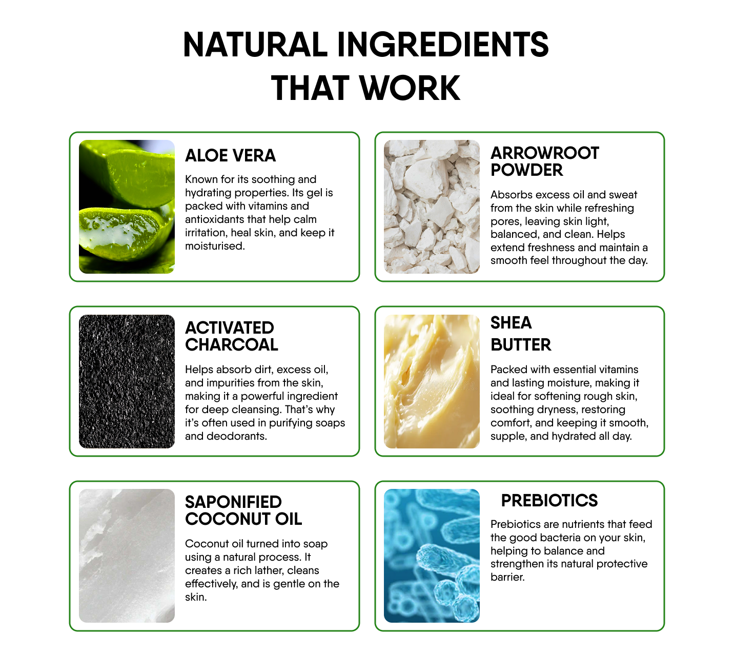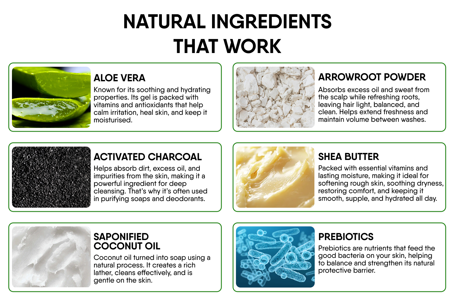 A natural deodorizer with activated charcoal that kills odour causing bacteria for an all-day fresh feel